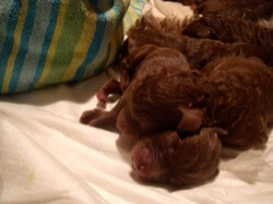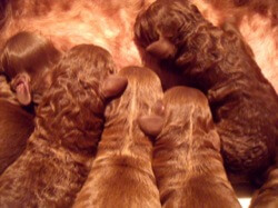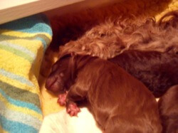 Al haar puppy’s zijn bruin; in diverse kleurschakeringen en ook in diverse varianten met al wat ‘ribbeltjes’ in de vacht tot redelijk gladde vachtjes. Omdat dit nogal verwarring geeft, hebben we ze inmiddels gemerkt met verschillende kleuren halsbandjes. Het is belangrijk om de pups vanaf de geboorte te volgen met betrekking tot gewicht en gedrag en daarom moeten we ze goed uit elkaar kunnen houden.