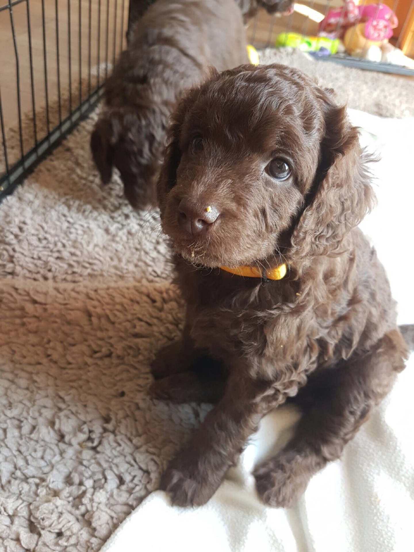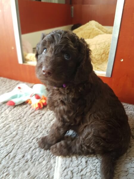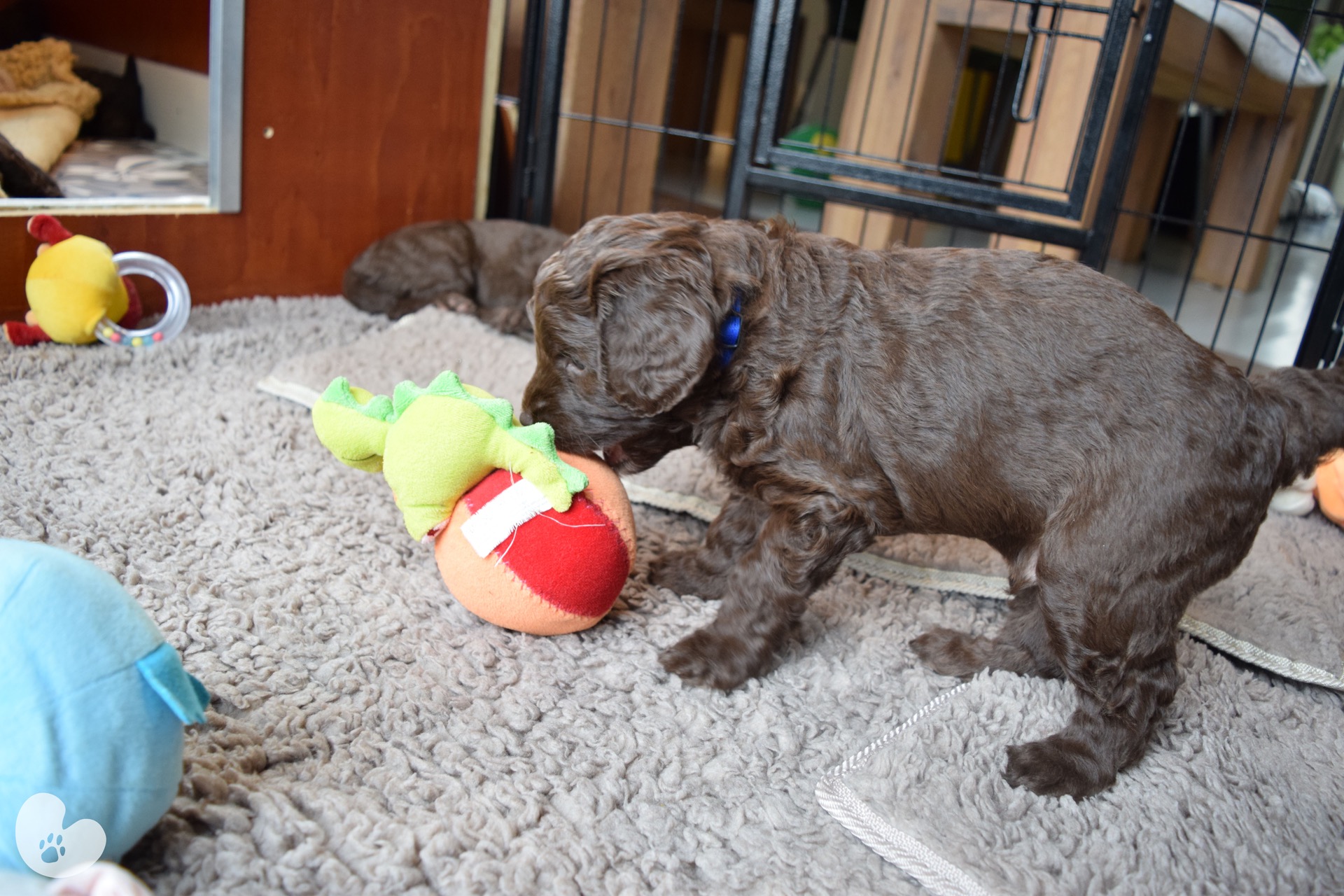Hoewel het risico op een fikse beet in je teen of oorlel nu inmiddels behoorlijk aanwezig is 😬. En een natte broek ook 😝. Waar voorheen Fay een goede poetsbeurt gaf en alle uitwerpselen opruimde, moeten we nu zelf aan de bak. Flinke plasjes die de pupjes al keurig in de ren doen. Ze worden wakker, rekken zich uit en stappen parmantig de werpkist uit om hun plas in de ren te doen. “Goed zo! Plasje gedaan!” (Ik ben al enthousiast aan het stimuleren!). De pupjes krijgen sinds deze week puppy-pap. En vanaf dat moment is het drolletjes rapen! Een handigheidje – noem het een ‘flukse beweging’ — die in het begin nogal eens wil ontaarden in een flinke smeerboel. Vooral als er naast het starten met puppy-pap ook nog tandjes doorkomen en er net ontwormd is… Een ‘poepbroek’ is een term die ik lang niet gebruikt had 😉. Als er acht kleintjes tegelijkertijd gaan kakken en daarbij op z’n ‘Doodles’ gehurkt wandelend hun drolletjes deponeren, kan er misschien een voorstelling gemaakt worden hoe dat eruitziet. Poep-pootjes, poep-matjes, poep-klompen (die draag ik tegenwoordig om droge sokken te houden), poep-hekrandjes, poep-broek dus en last but not least: poep-speeltjes! Zo leuk al die gaatjes en gleufjes waar de shit in kan komen. Lang leve de wasmachine en de emmer sop met dettol! Joepie-de-poepie.