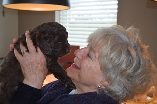 Maar buiten het poepgebeuren is het vooral genieten. Van alle kleine lieve koppies die observeren en leren. Indrukken opnemen en verwerken. Op schoot bij veel visite. Even mee naar buiten op de arm, wind op het snuitje voelen, vogeltjes horen, geuren snuiven. Stuk voor stuk ’s avonds op de bank bij één van de gezinsleden – een typisch gevalletje ‘win-win situatie’! En ook schrikken als moeders (ik in dit geval) ineens de radio flink luid zet en wild mee danst op een lekker nummer. Acht pupjes die verschrikt opkijken een sprintje naar de werpkist trekken om heel even later nieuwsgierig weer naar buiten lopen en rustig gaan kijken wat dat gekke mens eigenlijk aan het doen is. Heerlijk! Freonskip = Bliidskip!