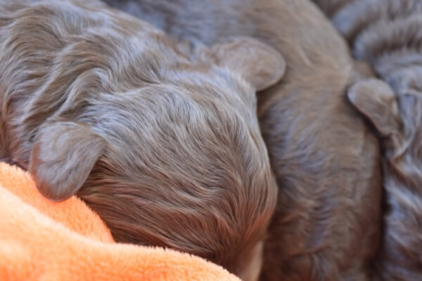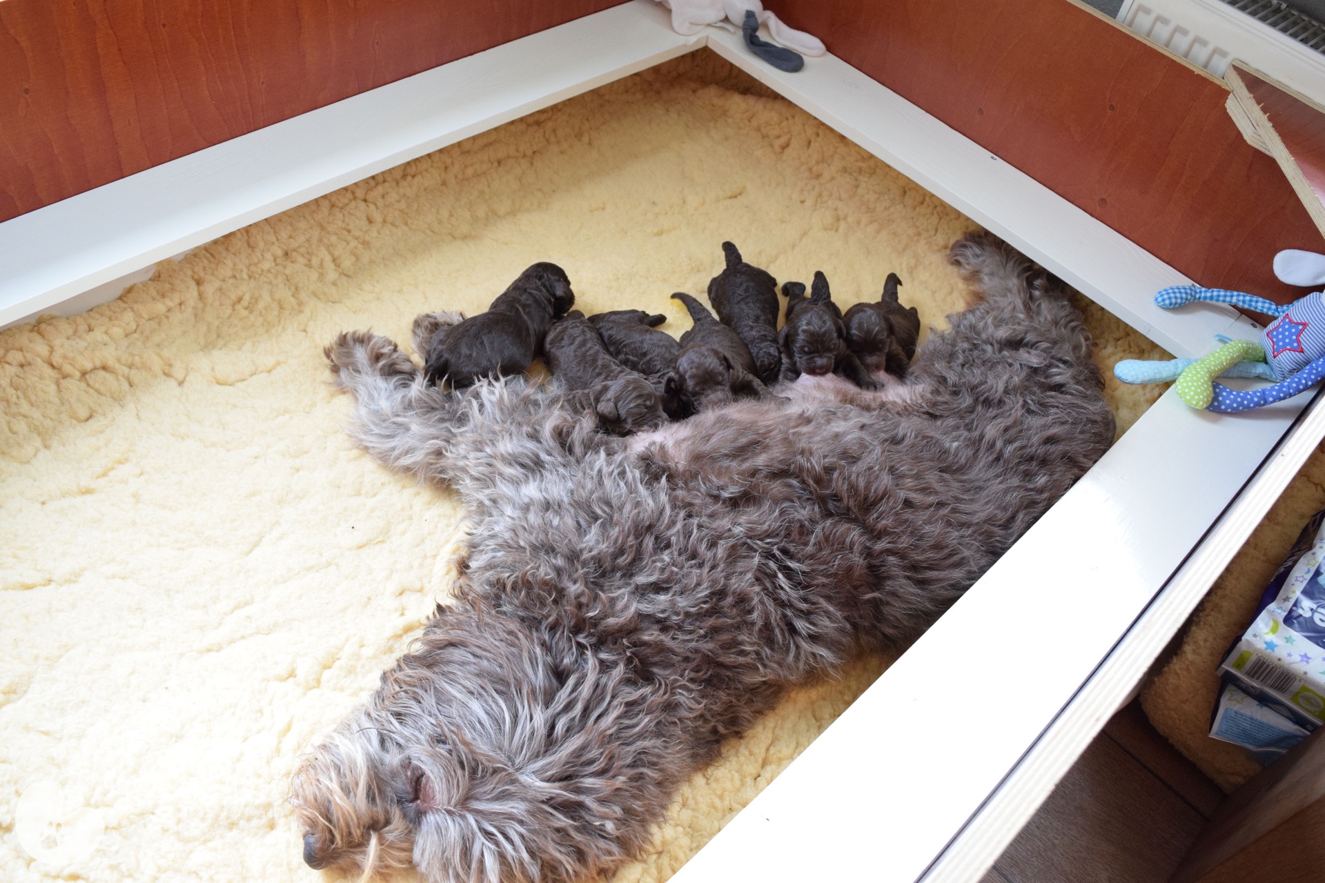 Saai? Nee in tegendeel. Hier raak je niet op uitgekeken. Nooit. Deze kleine hondjes, volop in ontwikkeling. Met oooh die kleine oortjes… en oooh die snuitjes, dat vachtje, die staartjes, de pootjes… Ik voel me een bevoorrecht mens! Steek m’n neus geregeld in het nest en snuif de geur van puppy’s, zalig. Aai de zachte lijfjes. Ze reageren op mijn hand, denken dat er wat te halen valt. Als kraamverzorgster help ik mee aan te leggen en zorg ik dat iedere pup evenredig gevoed wordt. Daarom staat mijn hand gelijk aan het krijgen van moedermelk.
