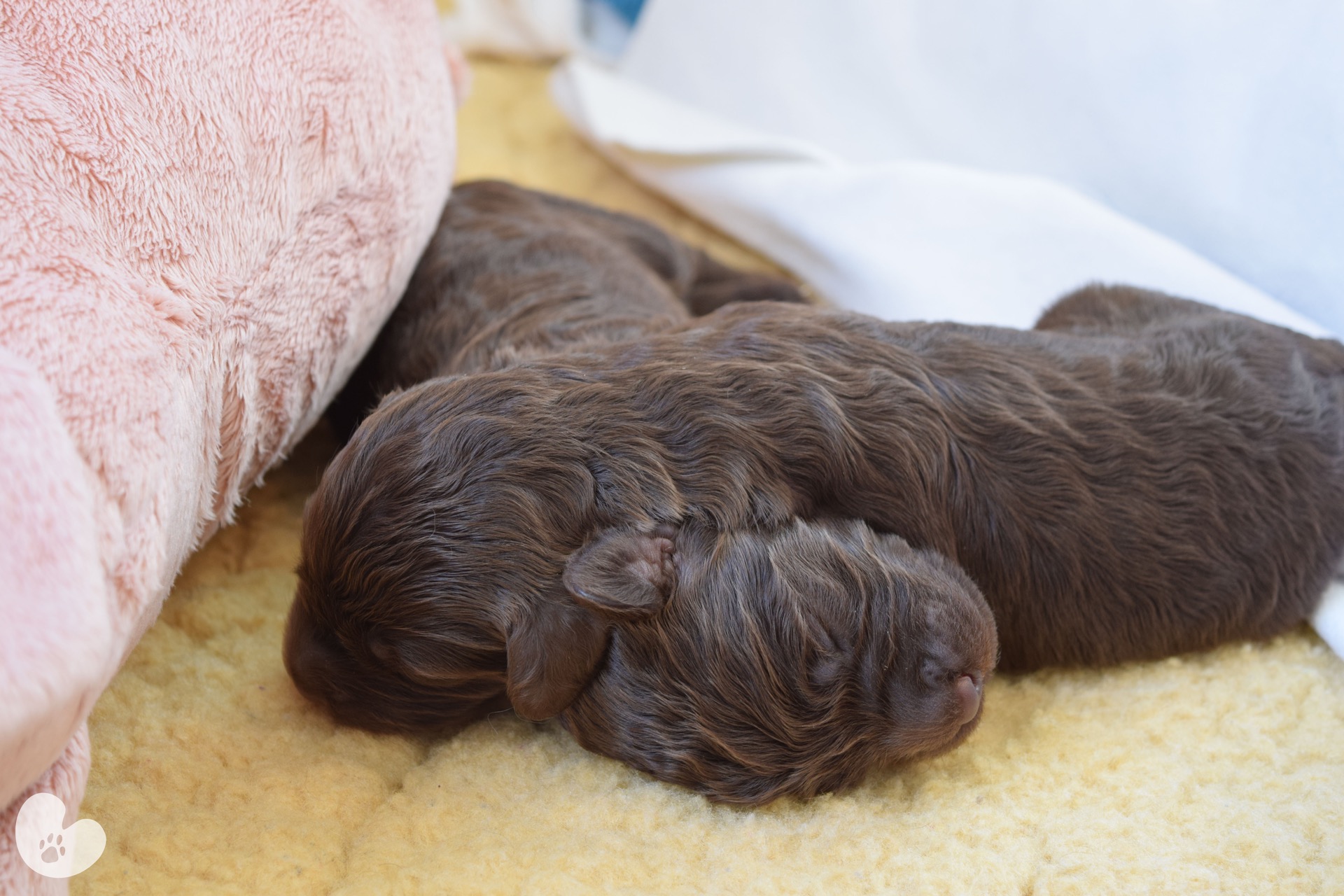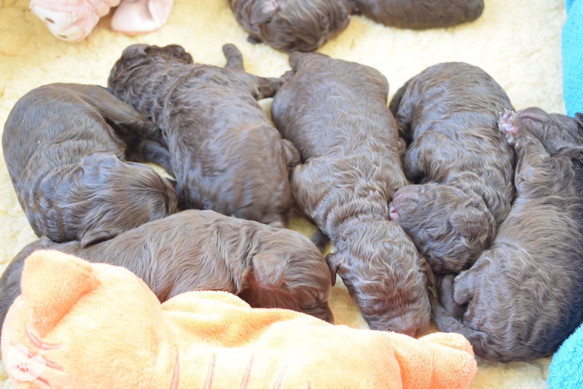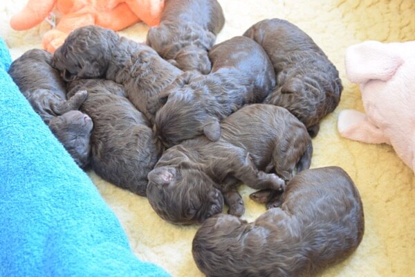 Daar liggen ze dan: acht overheerlijke glanzende chocotoffee-puppy’s. Ze zijn werkelijk onweerstaanbaar verleidelijk. Vreselijk saai zou je denken. Ze liggen daar maar eenvoudig ‘te zijn’. Tevreden en ontspannen. Drinken, slapen, drinken, slapen, drinken, slapen… Een continu proces. En mama Fay staat op stand-by. Zij zorgt en waakt, en zorgt en waakt. Ligt als een zeug op haar rug zodat haar pupjes goed bij de tepels kunnen. De kleintjes hebben soms zelfs even een ‘kontje’ nodig om de bovenste te kunnen bereiken 😉.