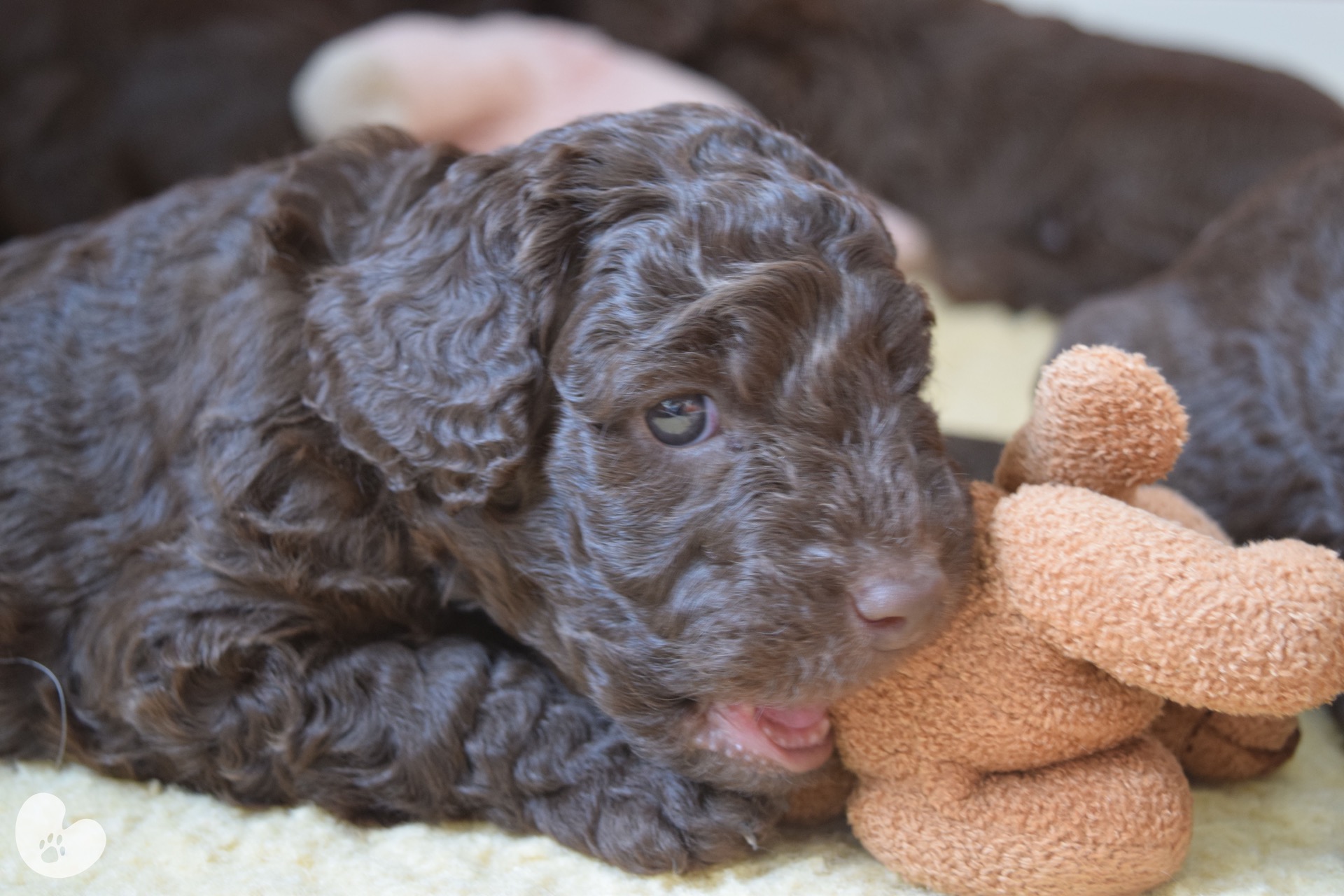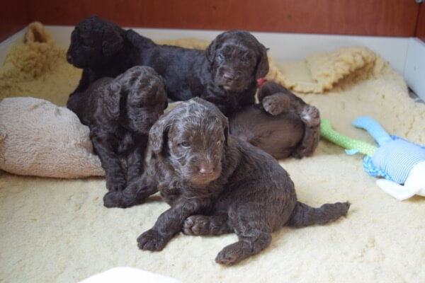 Onze pupjes zijn inmiddels alweer vier weken oud. Hun tandjes komen door, ze hebben de tweede keer ontwormen gehad, er zijn alweer nageltjes geknipt, haartjes bij de oogjes bijgeknipt, de werpkist uitgebreid met een puppyren en we zijn aan het Socialiseren!